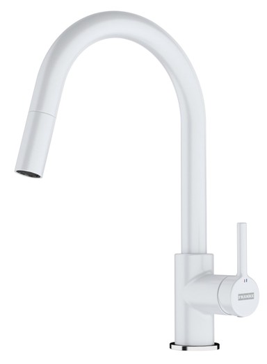 Franke Lina Doccia kuhinjska miješalica - bijela glečer, ističe se bazom promjera 54 mm, jednoručnom miješalicom, rotacijom cijevi od 150°, keramičkim uloškom promjera Ø35, fleksibilnim crnim najlon crijevima, jednostrukim mlaznim tušem i aeratorom.
