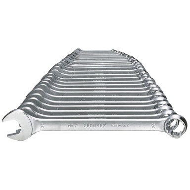 Set kombiniranih ključeva od 26 komada, napravljenih od visokokvalitetnog vanadijskog čelika s kromiranom površinom. Ključevi su dizajnirani prema DIN standardima. Prstenasta strana je pod kutem od 15 stupnjeva, što olakšava pristup teško dostupnim mjestima.