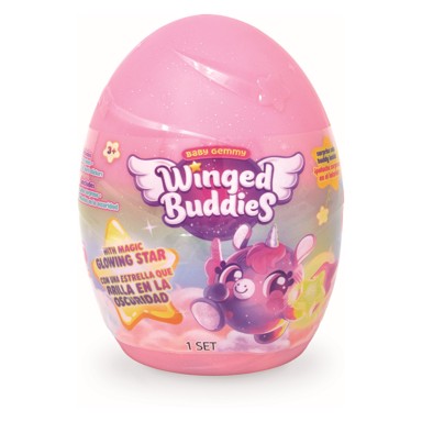 Mekani, čarobni i puni iznenađenja – skupi ih sve! Upoznaj očaravajuće Winged Buddies jednoroge — super mekane plišane jednoroge s magičnim sjajem! Svako jaje skriva plišanog jednoroga koji ima zvjezdicu koja svijetli u mraku na trbuhu i krilca s čičkom koja možeš nositi oko zapešća. Dolaze u raznim bajkovitim bojama i s čarobnim simbolima na prsima te naljepnicama koje svijetle u mraku za ukrašavanje tvoje sobe!
