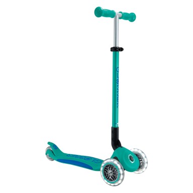 GLOBBER predstavlja PRIMO FOLDABLE PLUS LIGHTS, romobil s tri kotača u zeleno-plavoj kombinaciji, namijenjen djeci od 3 do 9 godina. Opremljen LED kotačima koji svijetle bez baterija i postaju intenzivniji s brzinom vožnje, ovaj model potiče sigurnu i zabavnu igru na otvorenom.