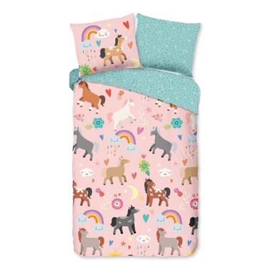 Ružičasta/tirkizna pamučna dječja posteljina za krevet za jednu osobu/za produženi krevet 140x220 cm Horses – Good Morning osigurava mekan i izdržljiv pamučni materijal, a kombinacija ružičaste i tirkizne boje s motivom Horses stvara veseo i maštovit ambijent u dječjoj sobi.