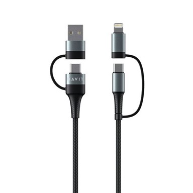Univerzalni kabel s četiri konektora – Lightning, microUSB, USB-C i USB – omogućuje punjenje i sinkronizaciju različitih uređaja iz jednog izvora. Idealno rješenje za korisnike s više uređaja, putovanja ili kao praktičan dodatak za kućnu upotrebu. Kompaktan, izdržljiv i izuzetno praktičan.