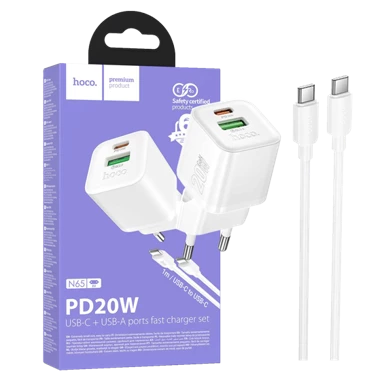 HOCO N65 Ingenious PD20W + QC3.0 GaN punjač s isporučenim USB-C–USB-C kabelom kombinira PD i QC brzo punjenje, dva izlaza (USB-C i USB-A) i vatrootporno kućište... Pročitaj više