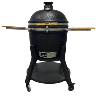 Njegov elegantni dizajn u grafitno crnoj boji upotpunjen je bočnim policama i ručkama od bambusa, dok stabilnost osigurava čvrsti metalni stalak s kotačima i dodatnom policom ispod roštilja. Precizna regulacija protoka zraka omogućena je aluminijskim gornjim otvorom i donjim ventilom od nehrđajućeg čelika, čime se postiže optimalna temperatura za različite načine pripreme hrane.