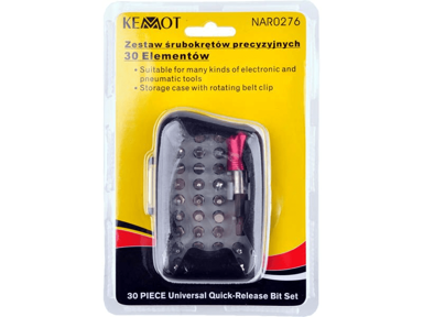 KEMOT set odvijača od 30 komada namijenjen je preciznim radovima, osobito u elektronici i računalima. Sadržaj uključuje TORX nastavke T6H do T40H, ravne nastavke SL3.0 do SL6.5 mm, križne PH0 do PH3 te imbus nastavke H2.0 do H6.0, uz pozidriv PZ0 do PZ3. Set pruža širok raspon profila za servis i montažu različitih uređaja.