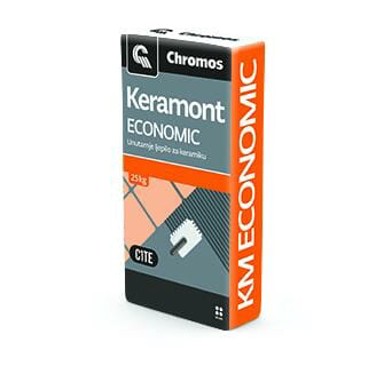 KERAMONT ljepilo za keramiku Economic 25 kg namijenjeno je unutarnjem lijepljenju zidne i podne keramike u stambenim prostorima i sanitarnim čvorovima te za međusobno spajanje graditeljskih elemenata od porobetona. Razreda je C1TE prema HRN EN 12004, otporno na vodu i postojano na povišene temperature do +70 °C, sive boje, te predstavlja praktičan izbor za standardne unutarnje primjene.