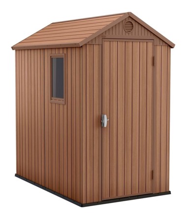 KETER Vrtna kućica DARWIN, 4x6 je vrtna kućica smeđe boje, otporna na vodu, snijeg i UV zračenje, s imitacijom drvenih letvica, ventilacijskim otvorom i ulaznim vratima s pričvrsnim šarcima.