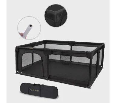 KIDWELL Vrtić za igranje FANKO 120x180 cm, crni je funkcionalno i sigurno igralište koje pruža siguran prostor za igru i promatranje okoline vašeg djeteta. Ogradica je dizajnirana tako da prati razvoj djeteta od prvih dana, kroz faze puzanja, sjedenja i ustajanja, pa sve do šestog godine života. Pomoću ove ogradice, vaše dijete može vježbati ravnotežu, učiti samostalnost te se naviknuti na kratke trenutke odvojenosti od roditelja. Ogradica je lagana, jednostavna za premještanje i sastavljanje bez potrebe za alatima. Osigurava maksimalnu sigurnost zahvaljujući zaštitnicima na spojevima i uglovima, dok pjenasti omotači okvira štite dijete od mogućih ozljeda. Mrežasta konstrukcija omogućuje dobru ventilaciju i preglednost, dok silikonke nožice na dnu sprječavaju klizanje. Ovaj model dolazi s praktičnim džepom za igračke, zvečku ili bocu, a patentni zatvarač omogućuje lak ulazak i izlazak, što je idealno za stariju djecu. Kompaktna veličina kada je sklopljena, uz transportnu torbu, omogućuje lako prenošenje na putovanjima.