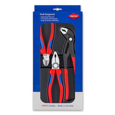 KNIPEX Set kliješta u tri dijela nalazi se u plastičnoj ladici s prozirnim poklopcem. Kliješta imaju polirane glave i plastificirane ručke koje pružaju sigurnije držanje. Set je namijenjen osnovnim mehaničarskim i kućnim zadacima.
