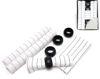 Poklon set sastoji se od dvanaest pažljivo usklađenih dijelova namijenjenih elegantnom i funkcionalnom posluživanju stola. U kompletu se nalaze četiri podmetača, četiri ubrusa i četiri drvena prstena za ubruse, čineći skladnu cjelinu pogodnu za svakodnevnu upotrebu ili posebne prigode. Neutralna i profinjena kombinacija elemenata lako se uklapa u različite stilove interijera.