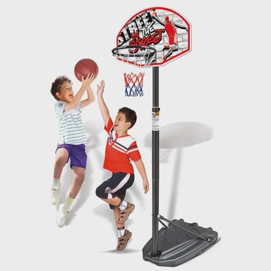 Košarkaški set 180-2 15-634000 namijenjen je djeci od 5 godina nadalje i pruža zabavan način za razvoj koordinacije i osnovnih sportskih vještina. U setu se nalaze stup podesive visine od 180 do 230 cm, ploča dimenzija 66 × 46 cm, obruč promjera 32 cm, gumena lopta te elementi za spajanje. Baza ima otvor za punjenje pijeskom ili vodom radi stabilnosti do približno 20 kg, a kombinacija plastike i metala osigurava čvrstoću pri svakodnevnoj igri.