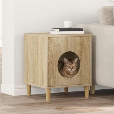 Moderna kućica za mačke pravokutnog oblika osmišljena je kao udoban prostor za odmor i sklanjanje. Konstruirano drvo osigurava dugotrajnost i otpornost na svakodnevnu upotrebu, a minimalistički dizajn diskretno se uklapa u interijer.