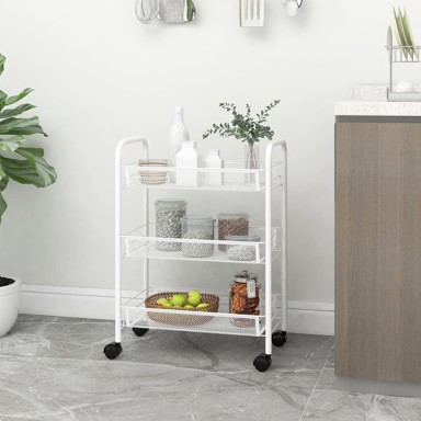 Kolica savršena su za organiziranje i razvrstavanje stvari u kuhinji, kupaonici, uredu itd. Kućanska kolica imaju željeznu konstrukciju, zbog čega su čvrsta i izdržljiva. Kolica koja štede prostor imaju 4 kotača, a 2 kotača imaju kočnice za lakše pomicanje i zaustavljanje. Mrežaste košare čvrste su i mogu se ukloniti te pružaju dodatni prostor za pohranu i u potpunosti iskorištavaju prostor. Kolica su idealna za spremanje igračaka, ključeva, hrane itd. - Boja: Bijela - Materijal: Željezo - Dimenzije: 46 x 26 x 64 cm (D x Š x V) - Uključuju 4 kotača (2 s kočnicama) - Čvrste mrežaste košare koje se mogu ukloniti - Sastavljanje potrebno: Da