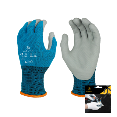 Zaštitne rukavice ARNO izrađene su od elastičnog materijala od najlona, a na dlanovima i vrhovima prstiju umočene su u PU (poliuretan) premaz. Vrlo dobro prijanjaju uz ruke te pružaju i zaštitu od kontaktne topline do 100°C.