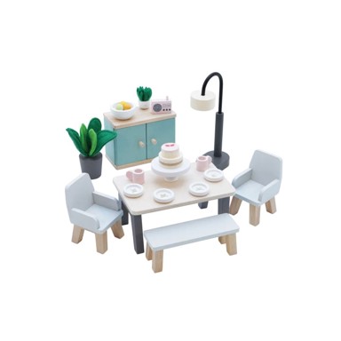 Daisylane blagovaona prostorija je u kojoj se nalaze drveni namještaj i dodaci karakteristični za blagovaonicu._x000D_ _x000D_ U ovom se setu tako nalazi ormar, starinski sat, stol s 4 stolice te mnoštvo sitnih dodataka poput jastučića za stolice, posuđa pa čak i drvene torte i muffini. _x000D_ Sve što se nalazi u ovom setu, veličinom je kompatibilno s ostalim Le Toy Van setovima i kućicama tako da nudi mogućnost kombiniranja i nadogradnje._x000D_ _x000D_ Lutkice nisu dio seta i njih je potrebno kupiti odvojeno._x000D_ _x000D_