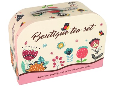 Set uključuje: - 4 šalice - 4 velika tanjura - 4 mala tanjura - 1 čajnik - 1 pladanj - 1 kutija za pohranu. Dimenzije dijelova seta: - šalica: 3 cm x 6 cm - promjer malog tanjura: 5,5 cm - promjer velikog tanjura: 9 cm - čajnik: 9 cm x 11,5 cm - pladanj: 24 cm x 16,5 cm. Dimenzije pakiranja: 25,5 cm x 10 cm x 18,5 cm. Igračke su namijenjene djeci starijoj od 3 godine. Set je CE certificiran i u skladu s EN 71 standardom.