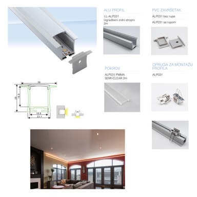 LED Profil ALP031 – zidni/stropni ugradni profil s mutnim difuzorom, završnim stranicama i oprugama za montažu, dužina 2 m, dimenzije 36×28 mm.... Pročitaj više