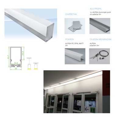 LED Profil ALP054 – profil za LED trake veće snage (>16 W) u kompletu s difuzorom i bočnim stranicama (ovjes naručuje se posebno), dužina 2 m, dimenzije 35×62 m... Pročitaj više