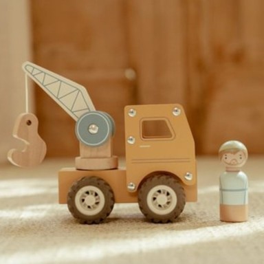 LITTLE DUTCH drveni kamion s dizalicom drveno je građevinsko vozilo s rotirajućom dizalicom i gumiranim kotačima za glatku vožnju. Uključen je i građevinski radnik, što potiče djecu na igru uloga i osmišljavanje scena s gradilišta. FSC certificirano drvo, kompaktne dimenzije i funkcionalna dizalica razvijaju koordinaciju, finu motoriku i razumijevanje osnovnih mehaničkih principa.