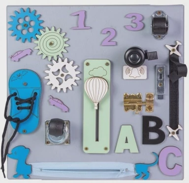 Manipulativna ploča mala obojena N opremljena je raznovrsnim mehaničkim elementima za razvoj fine motorike. Kompaktne dimenzije pogodne su za manju djecu.
