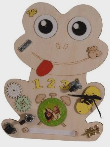 Manipulativna ploča Žabica dizajnirana je s naglaskom na šarene elemente i pokretne dijelove. Potiče učenje kroz igru i razvoj osnovnih motoričkih vještina.