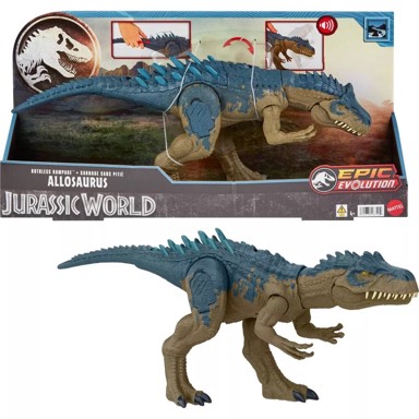 Figura Alosaura iz serije Ruthless Rampagin’ koristi okretni kotačić na leđima za izazivanje pokreta i agresivnih napada poput ugriza i rike. Pritiskom na gumb na repu aktiviraju se bodlje na leđima i repu, čime figura dobiva dodatni dramatični efekt. Za djecu od 4 godine i naviše.