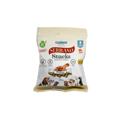 Mediterranean Natural Serrano poslastice dopunska je hrana za pse. Sadrže 70% mesa (60% u Mediterranean Natural Serrano za štence), ne sadrže gluten, umjetna bojila, GMO i transmasne kiseline. Oni su hipoalergenski proizvod (osim okusa "losos i tuna" i "za štence") i prirodni izvor oleinske kiseline. Idealni su kao nagrada i za dresuru tvog ljubimca.