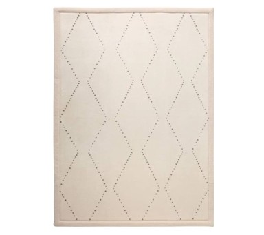 Dječji tepih dimenzija 200 x 150 cm s uzorkom točkica izrađen je od koraljnog baršuna, elastične memorijske pjene debljine 2,5 cm i protuklizne podloge. Osigurava ugodan i siguran prostor za dječju igru te se lako održava usisavanjem ili brisanjem vlažnom krpom. Ne sadrži štetne tvari poput BPA ili ftalata.