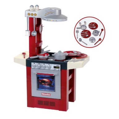 Kada stavite lonac ili tavu na štednjak i uključite ga, možete čuti prave zvukove kuhanja. Sastojke možete čuvati u hladnjaku, zapeći u pećnici i poslužiti na lijepim tanjurima. Malim sladokuscima nudimo sve što im srce i nepce požele. Također sudoper i slavina. Tako da možete ponoviti sve, oprostite: kuhate ono što vidite od naših sjajnih kuhara. Dječja kuhinja u dizajnu Miele, s kojom se može igrati s obje strane, oduševljava male kuhare u dječjim sobama sa štednjakom sa zvučnim modulom koji elektronički oponaša zvukove kuhanja. Opremljen je mnogim mogućnostima igranja i mnogim dodacima: pećnica, perilica posuđa, napa, sudoper i praktične ladice za pohranu. Tu je i lonac, lonac s poklopcem, kuhinjski pribor (lopatica, kutlača i dvije drvene žlice) i set za jelo za dvoje, svaki s po dva tanjura, vilice, noževi i žlice, te soljenke i paprenice.