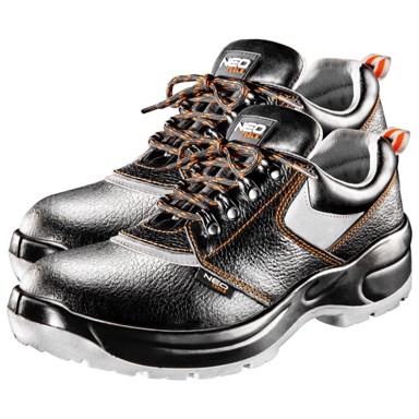 NEO TOOLS radne cipele 82-010 izrađene su od visokokvalitetne kože te pružaju iznimnu zaštitu i udobnost tijekom rada. Protuklizni potplat s ugrađenim sustavom za ublažavanje udaraca štiti noge od ozljeda, dok su potplati otporni na habanje, ogrebotine, masti, benzin i organska otapala, što ih čini idealnim za zahtjevna radna okruženja. Čelična kapica može podnijeti udarce do 200 džula, a čelični unutarnji potplat dodatno štiti stopalo. Antistatički sloj sprječava nakupljanje statičkog elektriciteta, a reflektirajući dijelovi povećavaju vidljivost korisnika. Cipele su certificirane CE oznakom i pripadaju SRA klasi otpornosti na klizanje, što znači da su posebno učinkovite na keramičkim površinama premazanim otopinom natrijevog dodecil-sulfata.