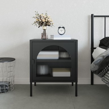 Noćni ormarić modernog dizajna predstavlja bezvremenski dodatak uređenju vašeg interijera. - Stabilan materijal: Okvir noćnog ormarića napravljen je od čelika obloženog prahom. Čelik je izuzetno čvrst i jak materijal. Nudi čvrstoću i stabilnost. Prah kojim je obložen čelik stvara zaštitni sloj protiv habanja. - Rebrasto staklo: Rebrasto staklo ima uzorak okomite teksture i može stvoriti maglovit dojam upotrebom reljefa koji istovremeno omogućuje prozirnost i privatnost. - Dovoljno prostora za pohranu: Ovaj ormarić nudi praktičan prostor za pohranu i čuvanje vaših časopisa, knjiga, daljinskih upravljača i drugih malih predmeta dobro organiziranima i na dohvat ruke. - Podesiva polica: Noćni ormarić opremljen je 1 podesivom policom na koju se mogu smjestiti predmeti različitih visina i veličina te izbjeći gubitak prostora. - Poravnjivači na dnu: Na dnu se nalaze poravnjivači za stabilizaciju ormarića kad stoji na neravnim podovima. - Stabilna površina: Stabilna površina bočnog ormarića idealna je za vaše omiljene ukrasne predmete poput vaza i lončanica. - Boja: Crna - Materijal: Čelik obložen prahom, rebrasto staklo - Dimenzije: 50 x 35 x 60 cm (Š x D x V) - S 1 podesivom policom - S poravnjivačima na dnu - Sastavljanje potrebno: Da