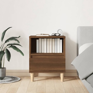 Noćni ormarić elegantnog dizajna predstavlja bezvremenski dodatak uređenju vašeg interijera. - Izdržljiv materijal: Konstruirano drvo iznimne je kvalitete s glatkom površinom, a također se odlikuje snagom, stabilnošću i otpornošću na vlagu. - Dovoljno prostora za pohranu: Noćni ormarić dizajniran je s pretincem i ladicom kako bi stvari bile organizirane i na dohvat ruke. - Drvene noge: Drvene noge daju proizvodu prirodan i ugodan izgled, a istovremeno osiguravaju stabilnost. Može se dobro uklopiti u svako uređenje interijera. - Stabilna i čvrsta površina: Površina bočnog ormarića savršena je za izlaganje vaših ukrasnih predmeta, okvira sa slikama i biljaka u posudama. Napomena: - Svaki proizvod dolazi s priručnikom za sastavljanje u kutiji radi lakšeg sastavljanja. - Boja: Smeđi hrast - Materijal: Konstruirano drvo, masivno drvo eukaliptusa - Dimenzije: 40 x 35 x 50 cm (D x Š x V)