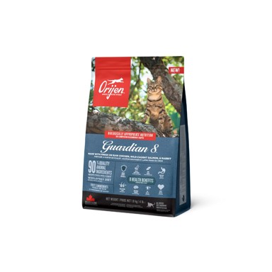 Orijen Cat Guardian potpuna je hrana za mačke svih pasmina i svaku životnu dob. S 90% vrhunskih životinjskih sastojaka, od kojih su 2/3 svježe i sirove, Guardian 8 sadrži hranjive sastojke koji pomažu u održavanju cjelokupnog zdravlja mačke s 8 dobrobiti. Ove dobrobiti uključuju podršku imunološkom sustavu, podršku zdravlju probavnog sustava, podršku zdravoj koži i dlaci, održavanje mišića, zdravlje srca zglobova,očiju te mozak i kognitivnu funkciju. Prvih 5 sastojaka su svježi ili sirovi Sastojci: od mesa peradi i ribe. Ova autentična WholePrey prehrana sadrži najsočnije dijelove plijena poput mišićnog mesa, organe i kosti kako bi oponašala ono što su preci mačke jeli u divljini.Pomaže podržati probavu s prebioticima kao što je sušeni korijen cikorije i prirodnim izvorima vlakana iz cijele bundeve, raštike, cijele jabuke i kruške.