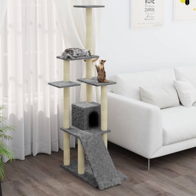 Penjalica za mačke savršeno je utočište na kojem vaše mačke mogu grebati, penjati se, spuštati, skrivati i odmarati. Daje vašim mačkama priliku da se rastežu i vježbaju, posebno u hladnim zimskim mjesecima kad moraju biti u zatvorenom prostoru. Vaši krzneni prijatelji mogu oštriti svoje kandže na stupovima za grebanje koji su omotani konopom od sisala, što osigurava zdravo mjesto gdje mogu zadovoljiti svoje nagone za grebanjem. Također će uživati loveći jedni druge i skačući gore-dolje po ovom zabavnom centru za igru. Kad se zasite igranja, vaši mali prijatelji uživat će u odmaranju na gornjim platformama, odakle im se pruža bolji pogled. Osim toga, mogu se sakriti u udobnoj kućici kako bi odrijemali ili se odmoriti na udobnom baršunastom sjedalu. Na dnu se nalazi i rampa za penjanje. Sa svim tim zabavnim značajkama, ova mačja penjalica sigurno će postati omiljeno mjesto vaših krznenih prijatelja! Boja: Svjetlosiva Materijal: Iverica, sisal, baršun Ukupne dimenzije: 54 x 73 x 155 cm (D x Š x V) S rampom, kućicom, stupovima za grebanje i platformama Sastavljanje potrebno: Da