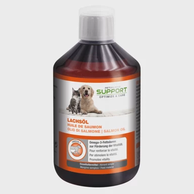 PETBALANCE Dodatak hrani za mačke SUPPORT LOSOSOVO ULJE, 500ml visoko je koncentrirano i sadrži 78% nezasićenih masnih kiselina, od čega su 30% omega-3 masne kiseline (eikosapentaenska kiselina (EPA) i dokozaheksaenska kiselina (DHA).