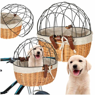 Pletena košara za bicikl za nošenje vašeg psa ili mačke odličan je način da svog četveronožnog prijatelja povedete na vožnju. Košara je izrađena od vrbe i ima metalni nosač za sigurnost vašeg ljubimca tijekom vožnje. Unutrašnjost košare je obložena tkaninom s cvjetnim uzorkom. Pričvršćuje se na upravljač bicikla pomoću remena. Nakon uklanjanja metalnog nosača, košara se može koristiti kao klasična košara za bicikl - praktična i elegantna.