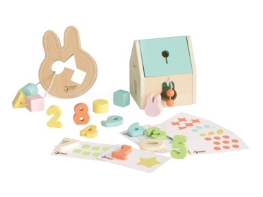 CLASSIC WORLD poklon set Edukativna kutija 4 u 1 za djecu od 12 do 18 mjeseci uključuje kućicu za umetanje oblika sa zecom, slagalicu, drvene brojeve i kartice s brojevima. Igračke izrađene od drva i prirodnih materijala potiču razvoj logičkog razmišljanja, koordinacije, prostorne mašte i prvih aritmetičkih vještina. Kutija je osmišljena kao kvalitetan poklon za prvi rođendan uz neutralne boje prikladne za svu djecu.