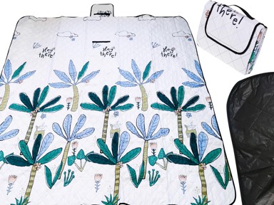Prostirka za plažu i piknik dimenzija 200 x 200 cm s uzorkom palmi idealna je za veća druženja i opuštanje na otvorenom. Izrađena je od pamuka i PEVA materijala, donja st… Pročitaj više