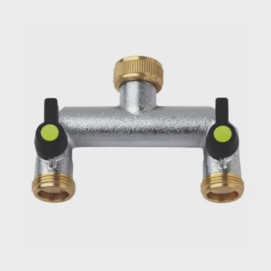 Račva s dva izlaza 1/2" izrađena je od poliranog mesinga i omogućuje paralelno spajanje dvaju crijeva ili sustava. Ravni dvostruki kuglasti ventil olakšava zasebnu kontrolu protoka na oba izlaza. Rješenje je kompatibilno s plastičnim sustavima crijeva te je prikladno za vrtne instalacije i navodnjavanje.