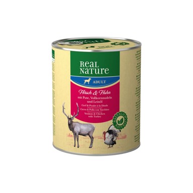 Real Nature Adult divljač i piletina s puretinom je potpuna hrana za odrasle pse pripremljena od divljači i piletine s puretinom te integralnom tjesteninom. Bez dodanih umjetnih konzervansa, bojila, aromatskih tvari ili šećera.