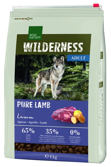 Real Nature Wilderness ide u korak s prirodnim instinktima vašeg psa. Proizvode temeljimo na prehrani vukova, predaka vašeg psa, što znači da svojem psu možete osigurati najprikladniju hranu za njegovu vrstu. Formula se sastoji od 65% visokokvalitetne janjetine, 35% voća, povrća i drugih vrijednih sastojaka te 0% dodanih žitarica. Među ostalim pomno odabranim sastojcima, sadržava svježe meso janjetine kao vrhunski izvor životinjskih bjelančevina i krumpir kao izvor ugljikohidrata.