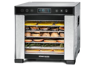 ROMMELSBACHER Dehidrator hrane DA 650 kombinira kompaktan dizajn s naprednim funkcijama za učinkovito sušenje i očuvanje hrane. Njegovo dvostruko zidano kućište od nehrđajućeg čelika osigurava trajnost, dok prostrana sušnica s površinom od 0,5 m² omogućuje istovremeno sušenje veće količine voća, povrća, mesa i drugih namirnica, zadržavajući pritom vitamine i minerale.