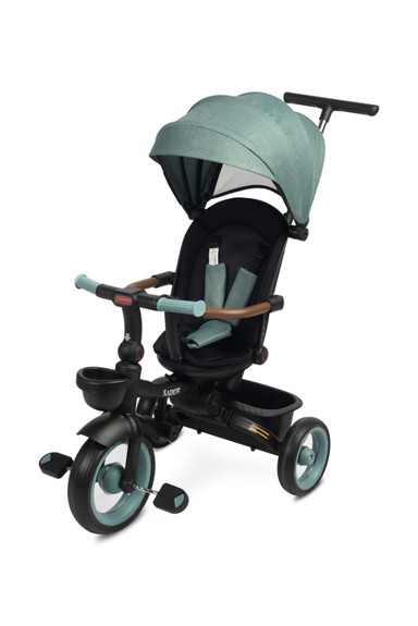 SABER dječji tricikl dizajniran je za djecu od 3 do 5 godina, uz mogućnost postupne prilagodbe od modela s roditeljskom kontrolom do samostalnog bicikla. Podesiva ručka s trostupanjskim podešavanjem visine (88–97 cm) i neovisne stražnje kočnice omogućuju potpunu kontrolu tijekom prvih faza učenja. Okretno sjedalo s podesivim naslonom, dva pretinca za pohranu te sklopivi baldahin koji štiti od kiše i UV zraka, čine ga funkcionalnim i udobnim za svakodnevnu uporabu.