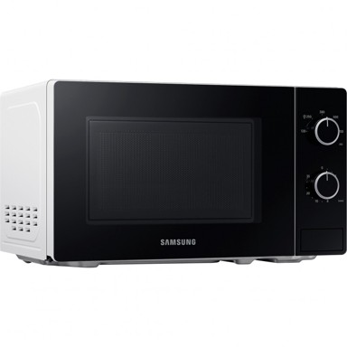 SAMSUNG Mikrovalna pećnica MS20A3010 AH SOLO, bijela s kapacitetom od 20 litara i snagom od 700 W dolazi s LED rasvjetom, okretnicom promjera 25,5 cm, pet razina performansi, brzim početkom i roditeljskim nadzorom, te se otvara s lijeve strane.