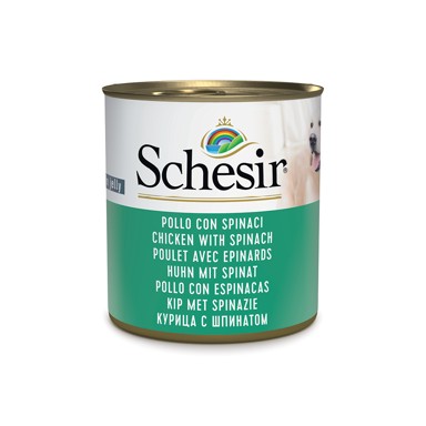 Schesir piletina sa špinatom u želeu, konzerva 285 g - dopunska hrana za odrasle pse. Receptura se temelji na ukusnoj piletini s dodatkom finog špinata, orginalni obrok pripremljen u primamljivom želeu.