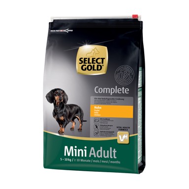 Select Gold Complete Adult Mini piletina posebno je razvijena, uravnotežena vrhunska suha hrana za male odrasle pse (težine 5–10 kg) dobi od približno 10 mjeseci i starije. Ova visokokvalitetna suha hrana proizvedena je od ukusnog svježeg pilećeg mesa i dobro se podnosi. Razvoj vrhunske formule posebno je temeljen na prehrambenim i fiziološkim potrebama malih odraslih pasa. Može pospješiti razvoj i održavanje stabilne crijevne flore s prebiotikom (inulin). Hrskavi i tvrdi kroketi mogu pridonijeti mehaničkom čišćenju zuba. Vrijedne omega-3 i omega-6 masne kiseline iz lososova ulja i suncokretova ulja uz dodatak cinka i pivskog kvasca pridonose zdravlju kože i lijepom izgledu krzna. Bez dodanih šećera ili soje. Bez umjetnih konzervansa, bojila ili aroma.