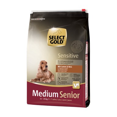 Select Gold Sensitive Adult Medium janjetina i riža posebno je razvijena, uravnotežena vrhunska suha hrana za srednje starije pse (težine od 11-25 kg) dobi od približno 7 godina i starije. Janjetina kao odabrani izvor životinjskih bjelančevina i riža kao izvor ugljikohidrata savršeni su za pse s intolerancijom na određene sastojke i osjetljivim želucem. Sadrži manan-oligosaharide i prebiotik inulin koji mogu pospješiti razvoj i održavanje stabilne crijevne flore. Posebno za starije ljubimce sadržava: polifenole iz zelenog čaja, važne vitamine, beta-glukan i selenij. Bez dodanih šećera ili soje. Bez umjetnih konzervansa, bojila ili aroma.