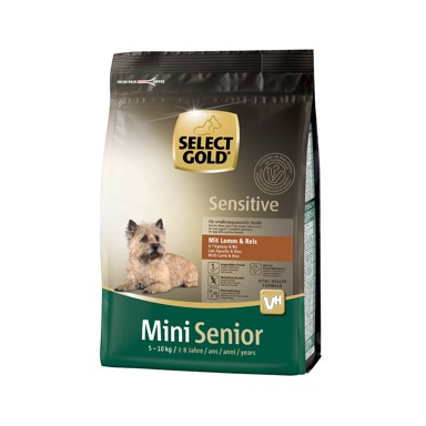 Select Gold Sensitive Adult Mini janjetina i riža posebno je razvijena, uravnotežena vrhunska suha hrana za male starije pse (težine od 5-10 kg) dobi od približno 8 godina i starije. Janjetina kao odabrani izvor životinjskih bjelančevina i riža kao izvor ugljikohidrata savršeni su za pse s intolerancijom na određene sastojke i osjetljivim želucem. Sadrži manan-oligosaharide i prebiotik inulin koji mogu pospješiti razvoj i održavanje stabilne crijevne flore. Posebno za starije ljubimce sadržava: polifenole iz zelenog čaja, važne vitamine, beta-glukan i selenij. Bez dodanih šećera ili soje. Bez umjetnih konzervansa, bojila ili aroma.