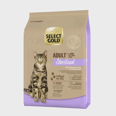 Select Gold Sterilised Adult s peradi i rižom je posebno razvijena, uravnotežena i potpuna suha hrana za odrasle mačke od otprilike 12 mjeseci starosti. Ova visokokvalite... Pročitaj više