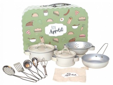 Set za kuhanje u koferu donosi 13 metalnih i pomoćnih elemenata poput lonaca, tava, cjedila i kuhinjskog pribora, organiziranih u praktičnom kovčegu. Dijelovi su od nehrđajućeg čelika i lako se čiste, a kofer služi i kao mala ploča štednjaka oslikana na poleđini. Dimenzije su oko 29 x 9 x 20 cm; pribor nije namijenjen zagrijavanju na pravoj ploči.